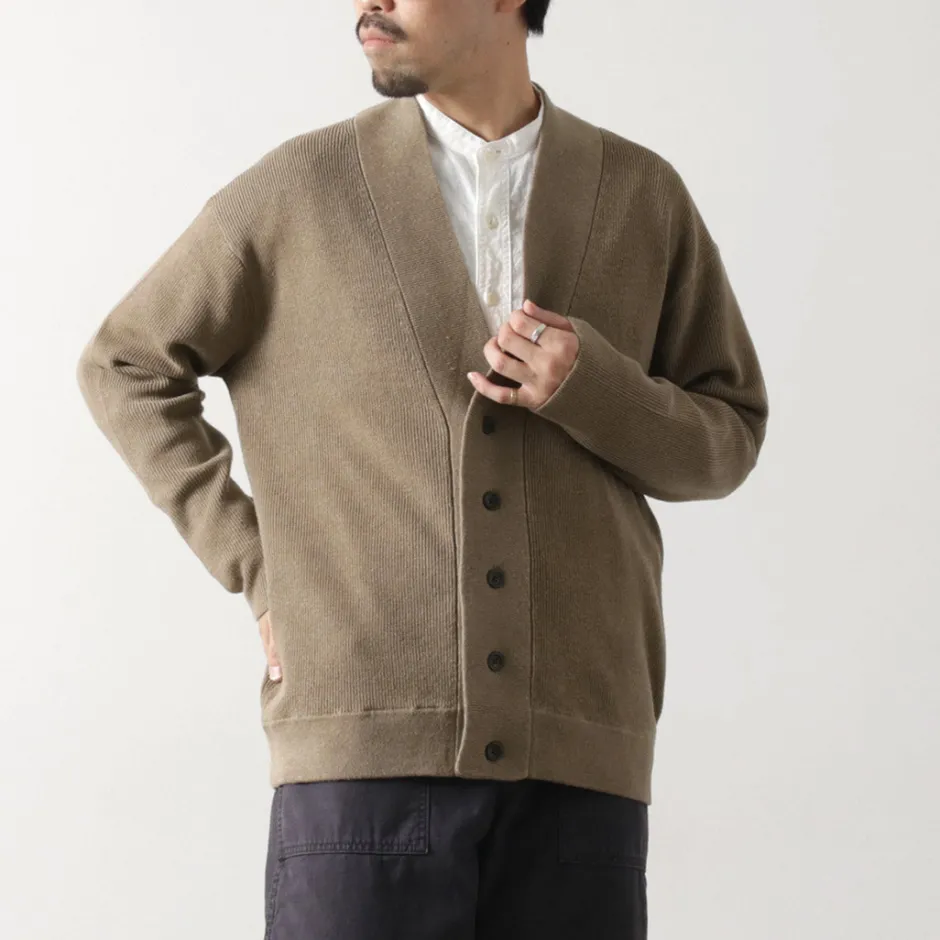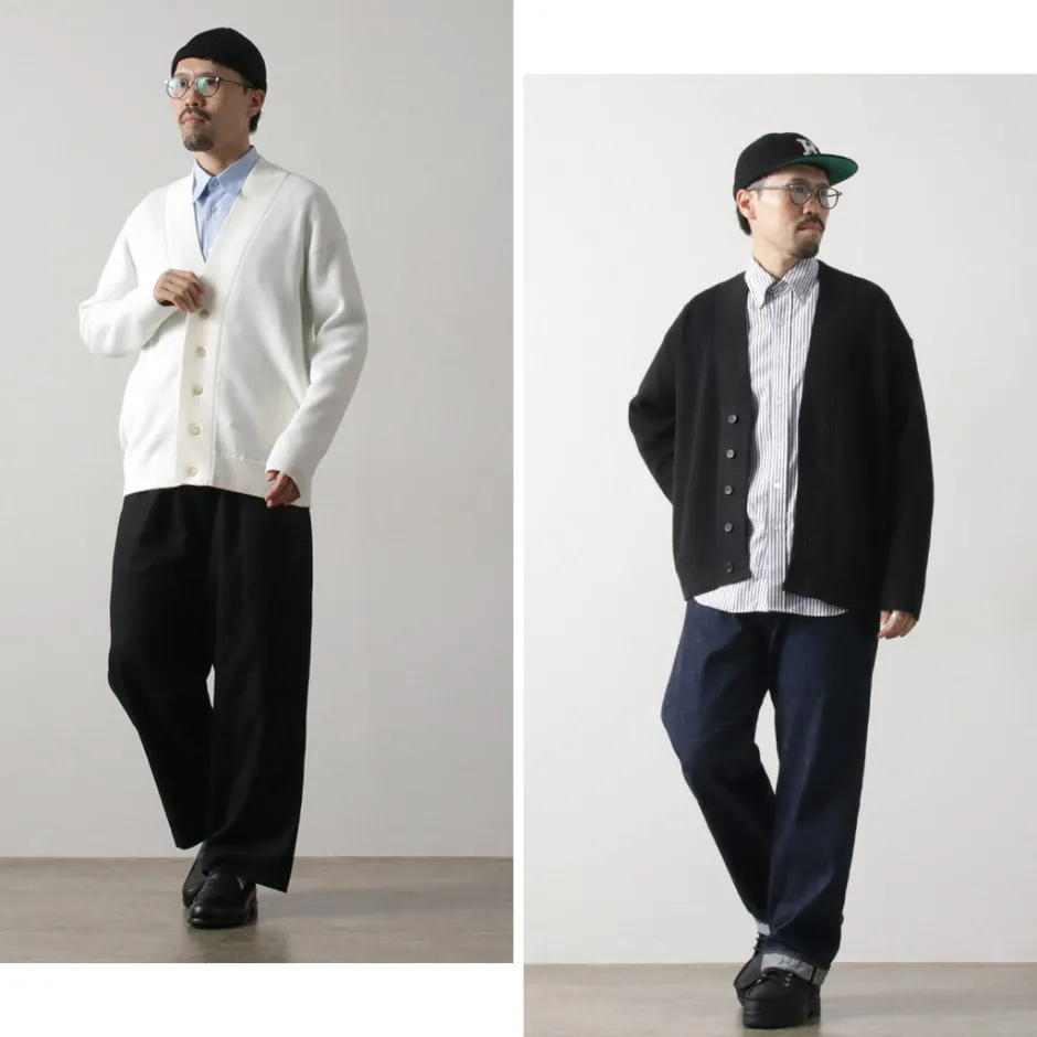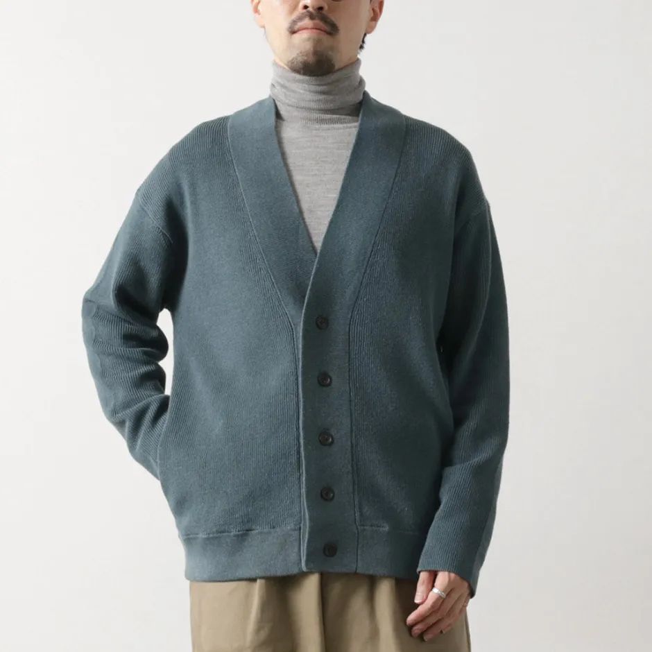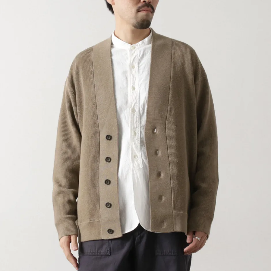 This cardigan, with its wide front placket and ribbed edges, adds a sense of openness to your styling simply by throwing it on. When worn with the buttons open, the front naturally falls, making it a cardigan that you can throw on with a relaxed atmosphere.