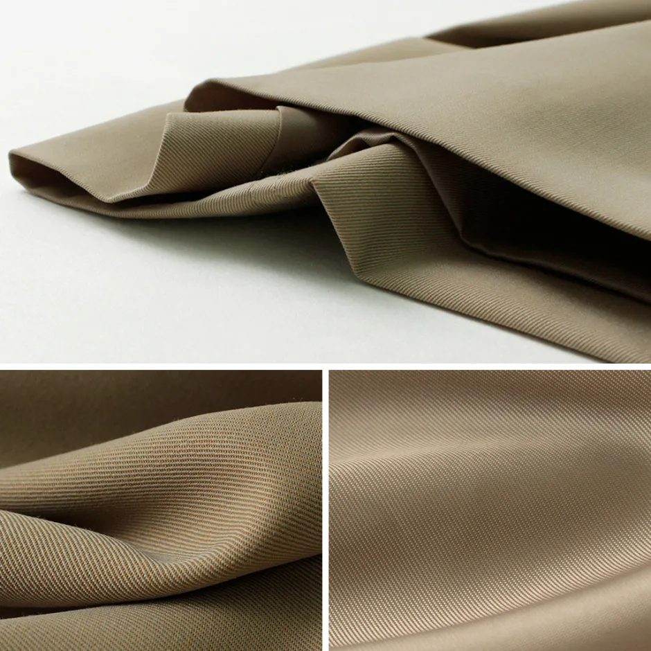 The fabric is a warm, breathable, and soft wool gabardine. It is woven with finer yarns than usual, giving it a characteristic drapey, falling finish.
