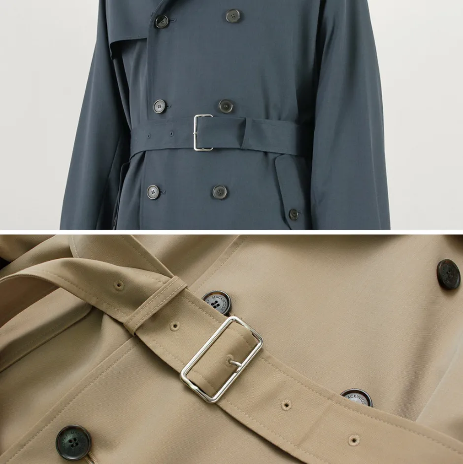 Introduction of a double-breasted trench coat made of elegant wool gabardine.