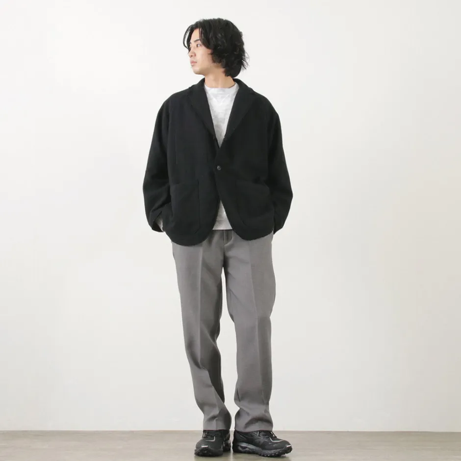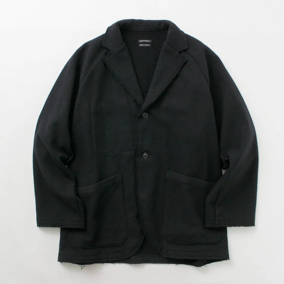 Introducing a jacket designed based on American medical wear. This item has an elegant tailored jacket with cut-off details for a rough finish, giving it a good sense of slackness. Warm wool mosser fabric is used for the fabric, creating a seasonal mood.