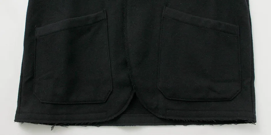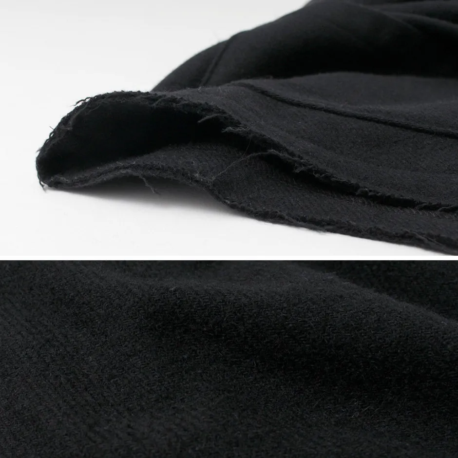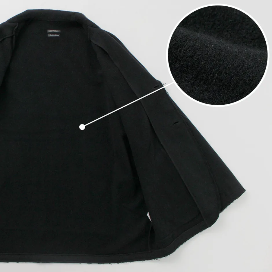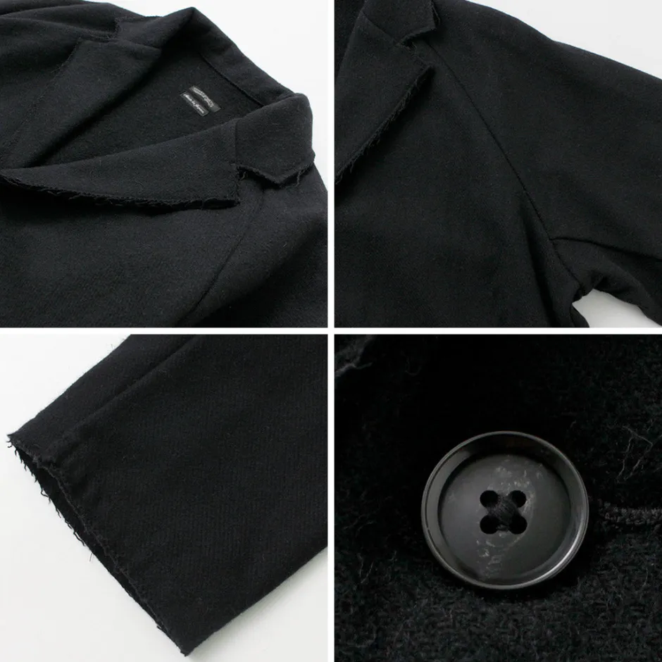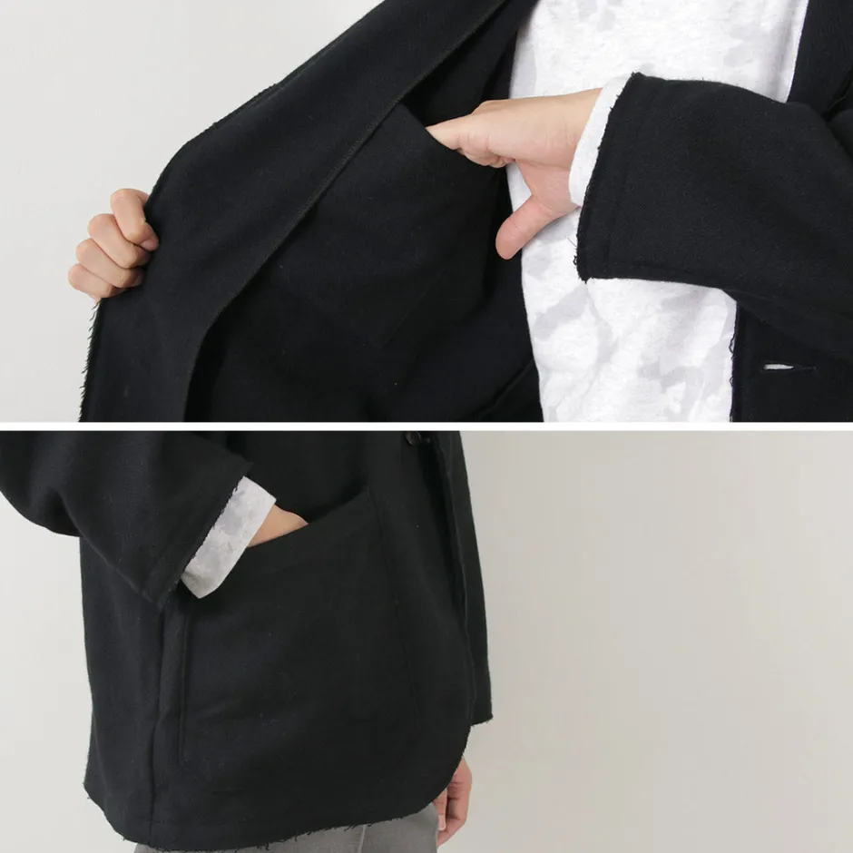 This item is an elegant tailored jacket with cut-off details to create a rough finish, giving it a good sense of discretion. The warm wool mosser fabric is used to create a seasonal mood.