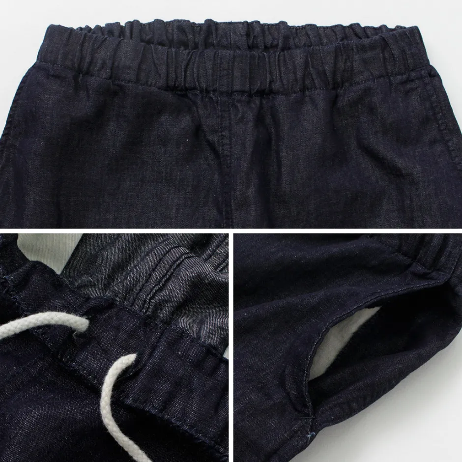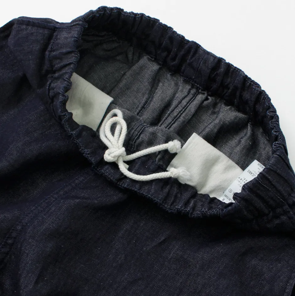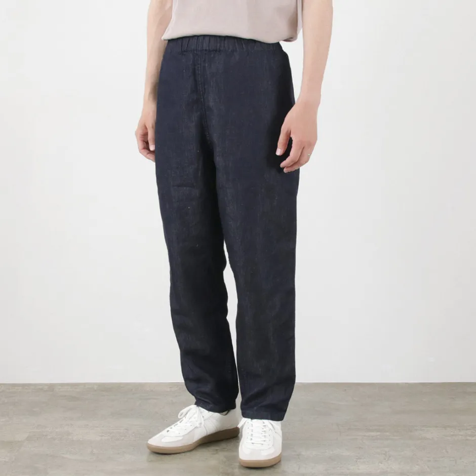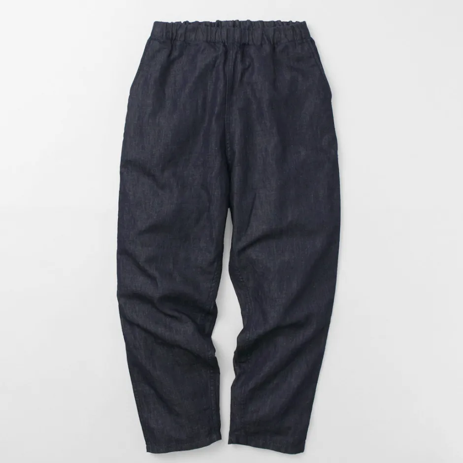 While most easy pants have a locked finish, these pants have a thicker seam by using rolled seams to achieve a clear and distinct puckering. This gives the pants a vintage, rugged look, and the luster of the cotton linen accentuates the unevenness of the puckering.