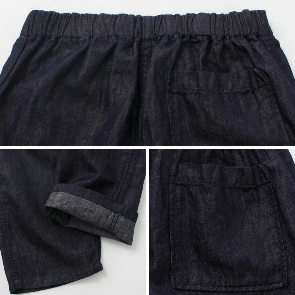 They are made of light-weight cotton-linen denim with an elegant sheen and light fabric feel.