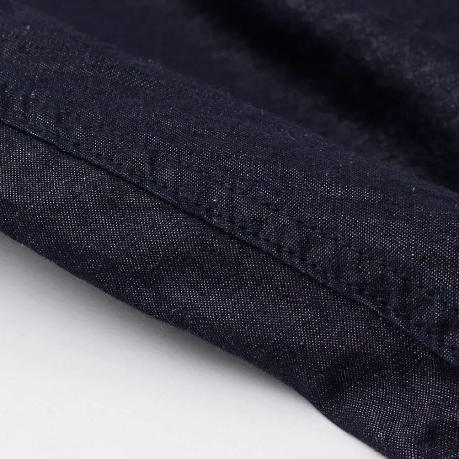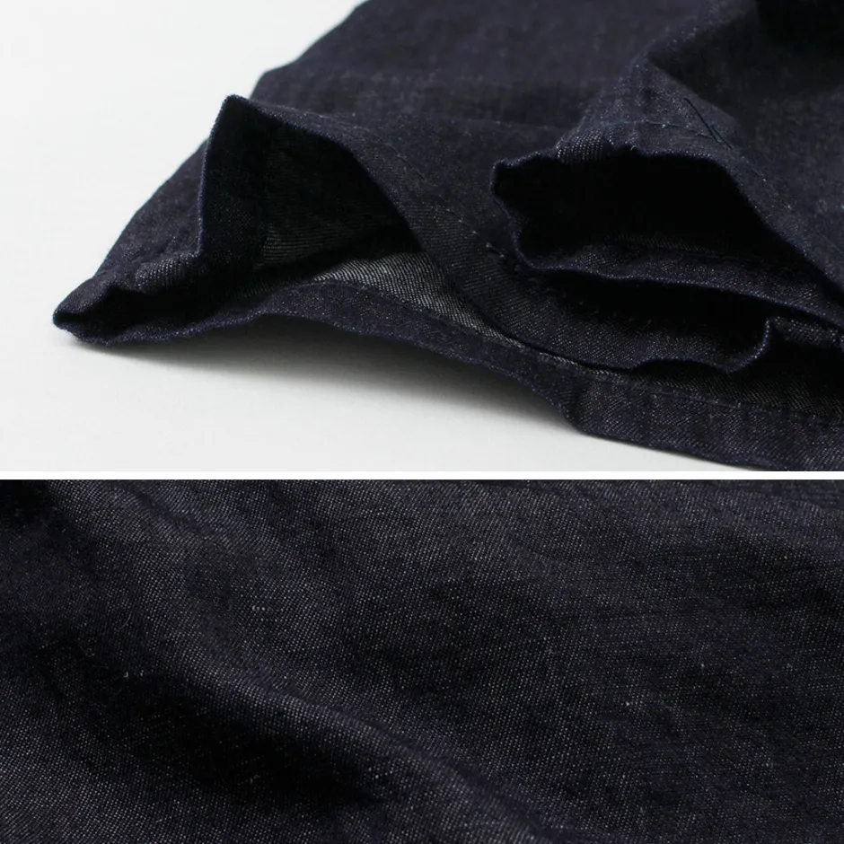 This item is made of a 6 oz. cotton-linen denim fabric with a strong sheen that stands out for its elegance. The finish is irresistible with its elegance that is at odds with the denim’s work element. It is thin and can be worn for a long season, and its unique nep-like appearance is also attractive. The more you use it, the more the texture will increase.