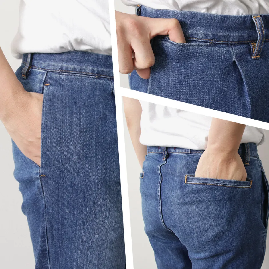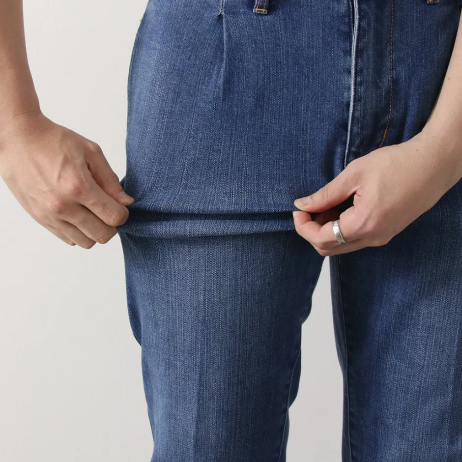 Kaihara, which accounts for 50% of the domestic denim market, uses a three-way blend high-power stretch denim for a supple fit. The use of hollow fibers has a heat storage and breathability enhancing effect, making it comfortable to wear in all seasons.