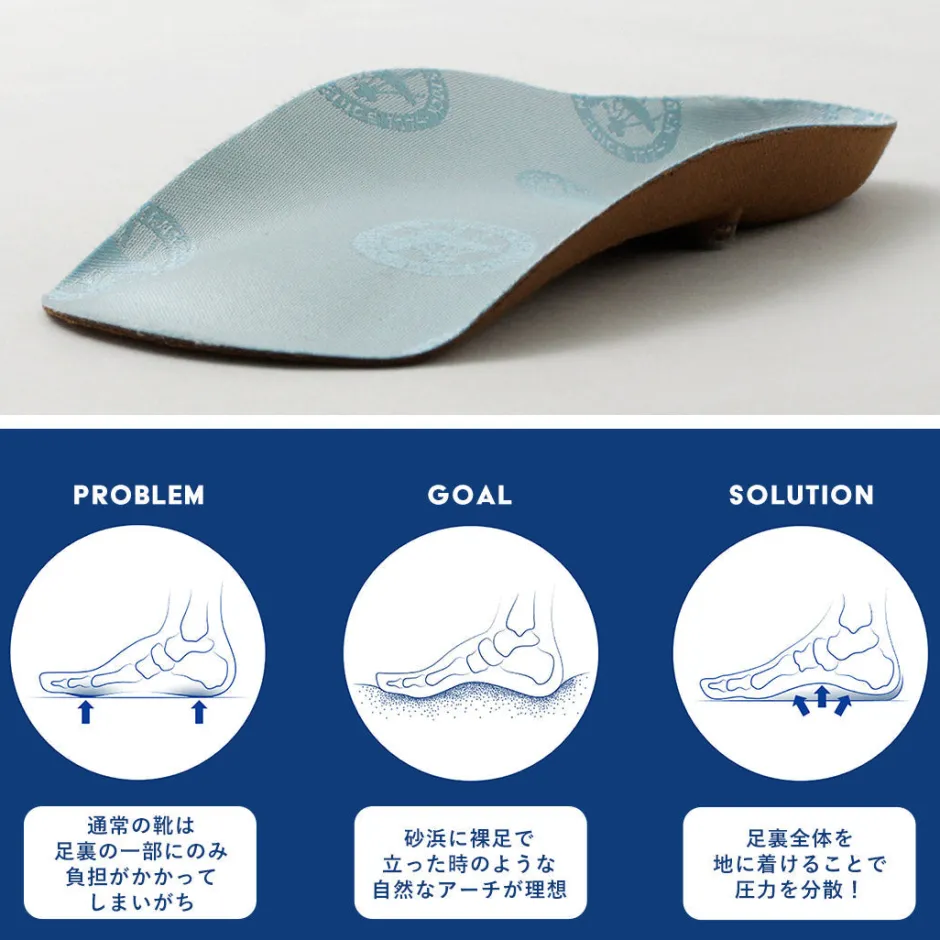 The insole is designed to support the weight evenly on the entire foot, as if you were standing barefoot on a sandy beach. The heel is wrapped around the foot, and the foot is firmly planted on the ground.