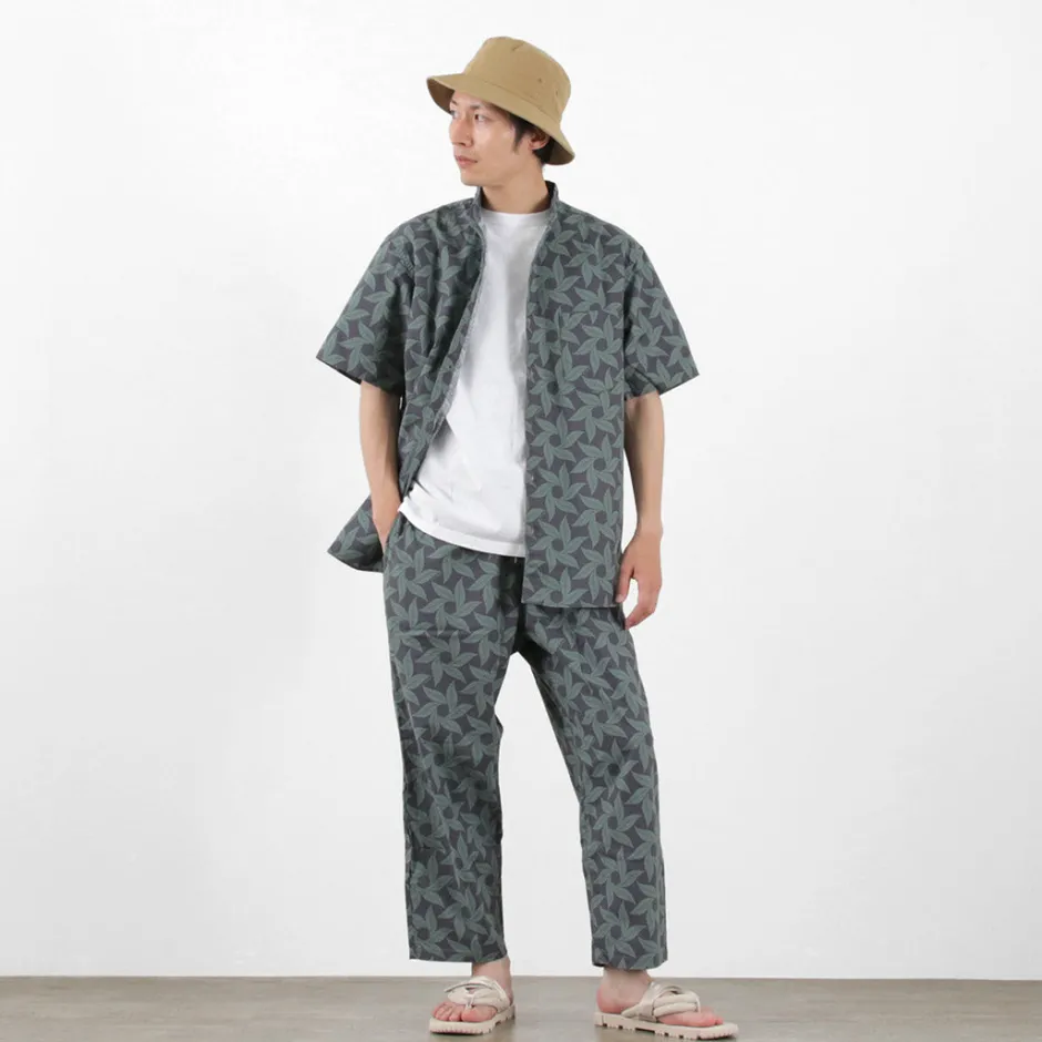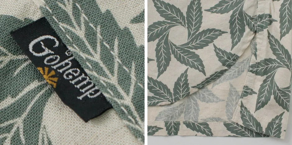 The brand’s original all-over patterned fabric with a motif of hemp leaves is used. The blend of 85% cotton and 15% hemp gives the fabric a cool and refreshing feel. Its dry feel against the skin and hemp’s unique moisture absorption and quick-drying properties make it comfortable to wear even during the sweaty season.