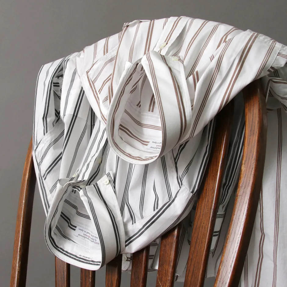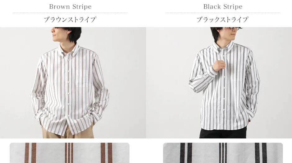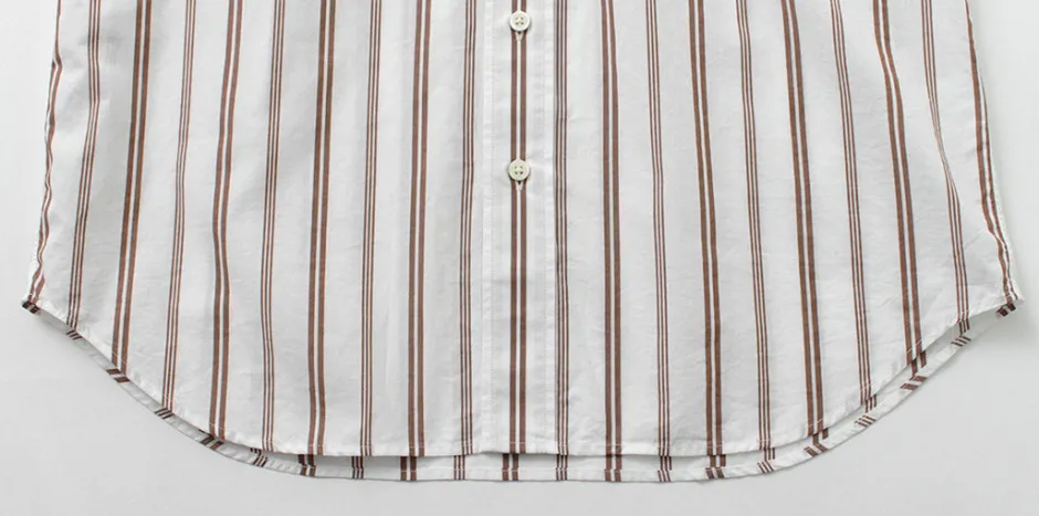 This shirt uses 100% Supima cotton fabric known for its soft touch and resilience. The pattern is a subtle random stripe that can be worn as an inner layer with a jacket or as the main piece of a spring outfit.