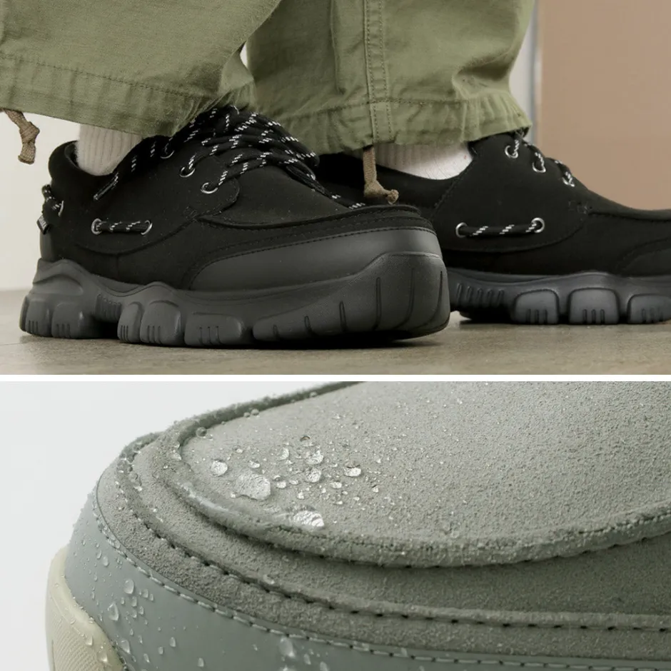 The upper features a traditional and basic yet trendy moccasin shoe design. It’s made of microfiber material with a suede-like texture that feels just like genuine leather. It’s also treated with water repellent for high practicality even in adverse weather conditions.