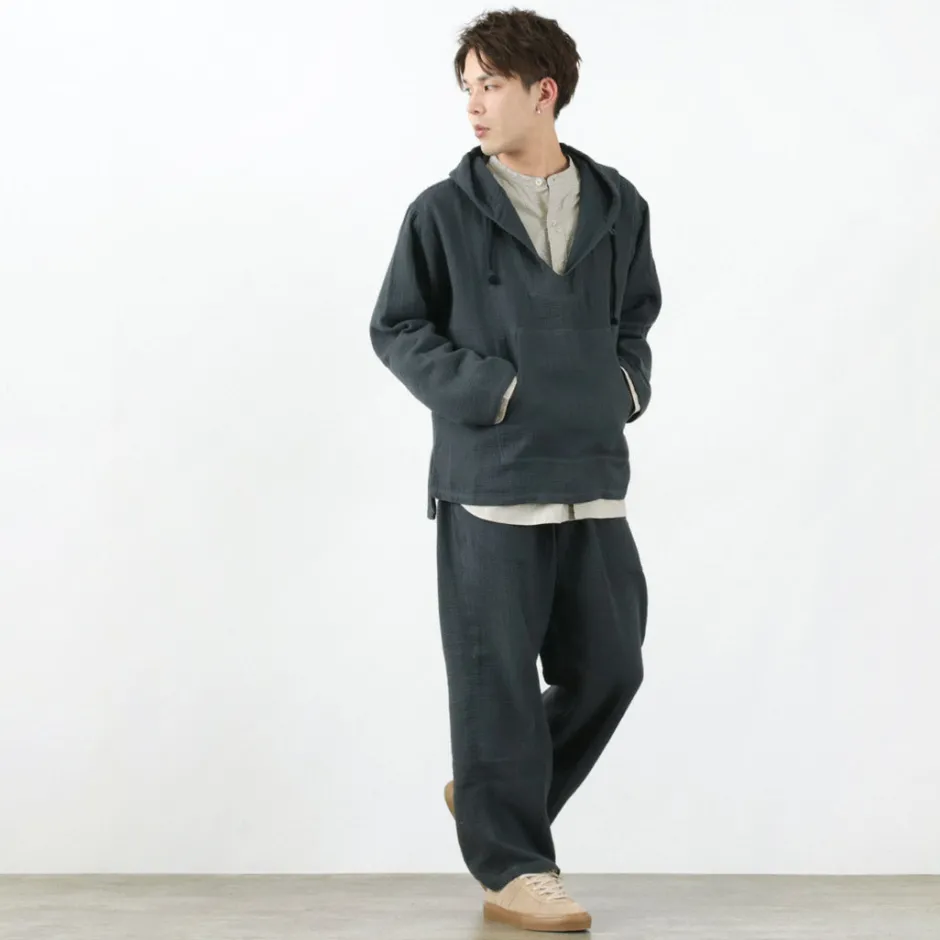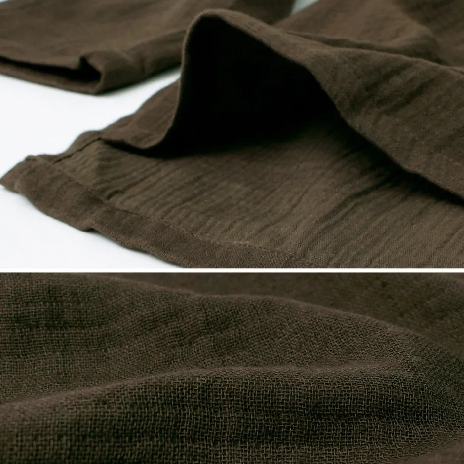 The fabric is made of thin gauze of 100% cotton. It is triple-jointed and extremely soft against the skin, keeping you dry and comfortable even in warm weather.