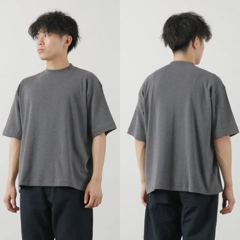 Features a mock neck with a moderate height. It offers the casualness of a crew neck tee while adding an elegance not found in regular crew neck tees.