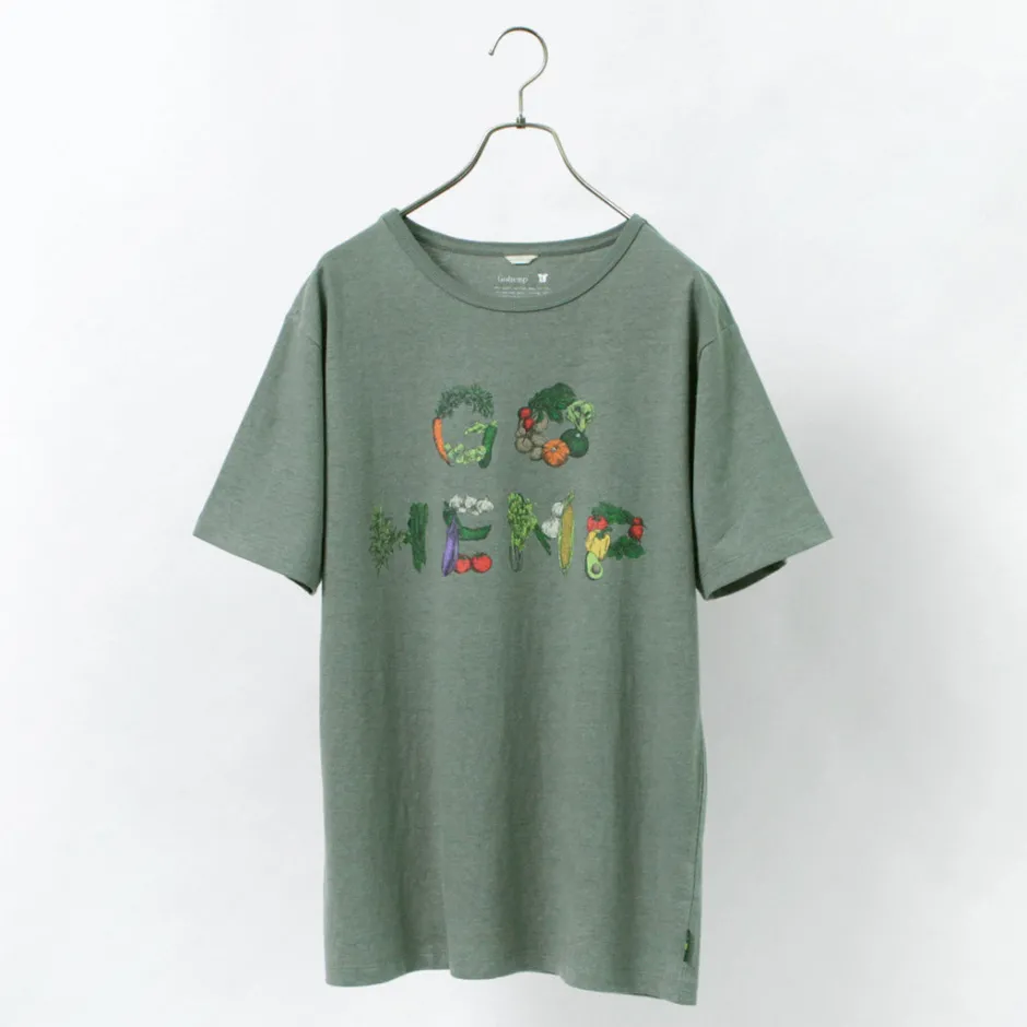 Printed T-shirt designed under the theme ‘hello nature’ from GOHEMP ART LABO. The print expressing the brand name in veg and herb has a colourful and energetic impression, but combined with the softness of the body, it creates a warm atmosphere that is not too flashy.