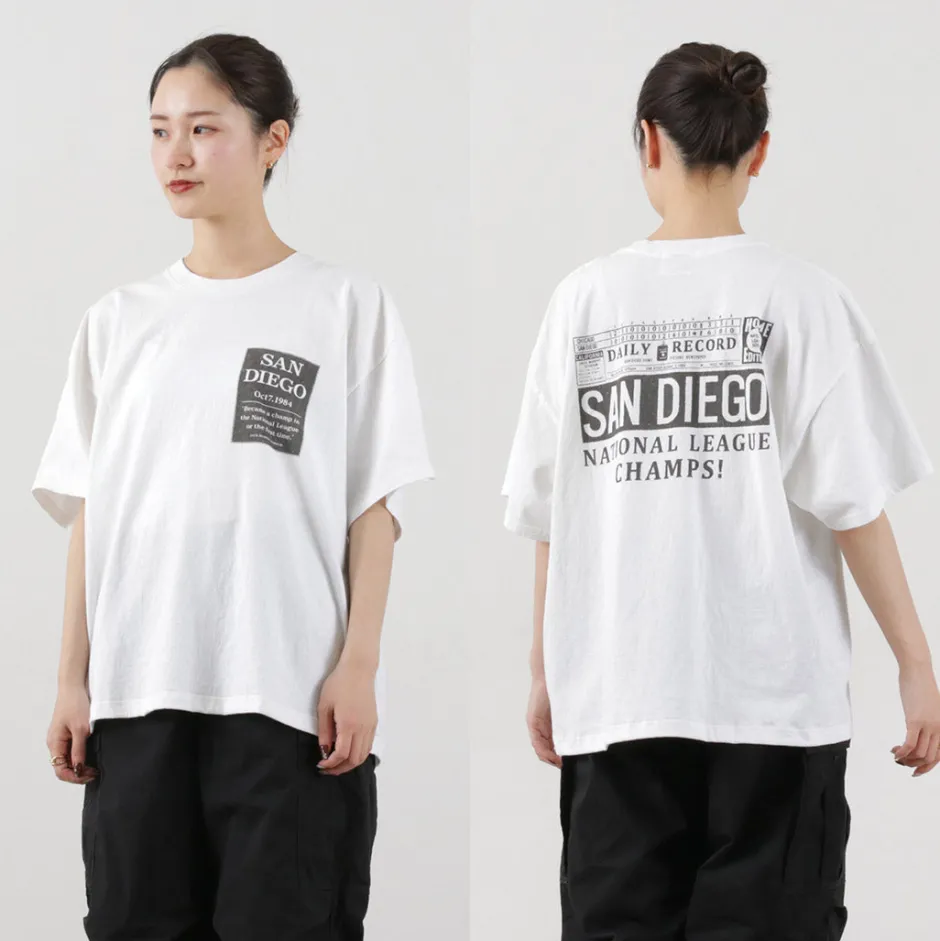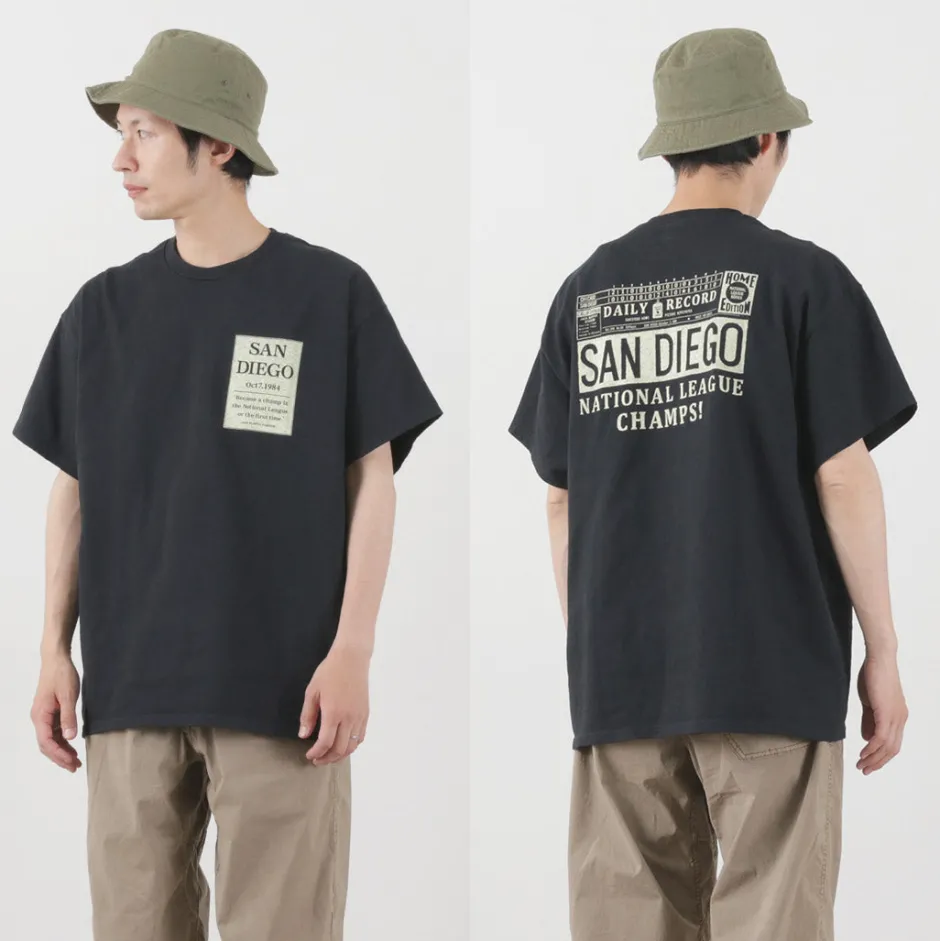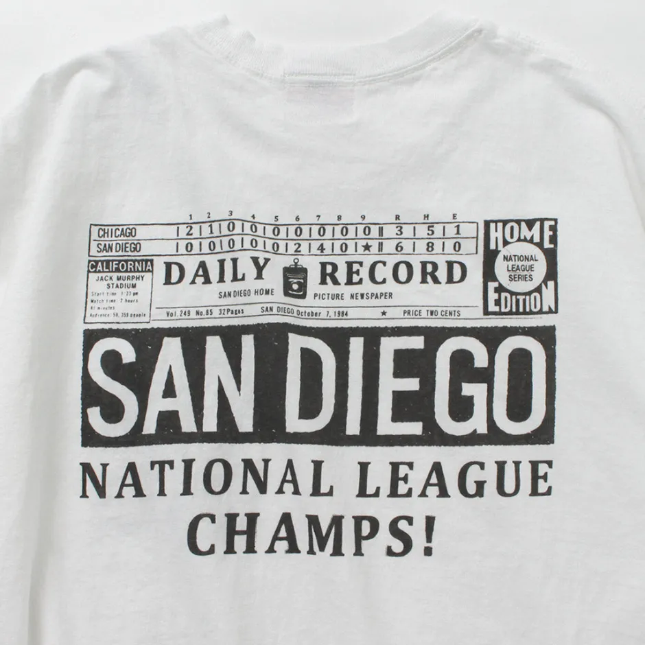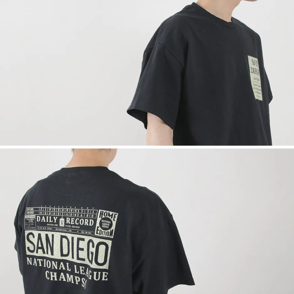 Designed as a fictional commemorative T-shirt inspired by the newspaper headlines of the time when the San Diego Padres won the National League in 1984. The print faithfully reproduces the lettering rubbing and shaking characteristic of old newspapers, which is one of the sticking points.