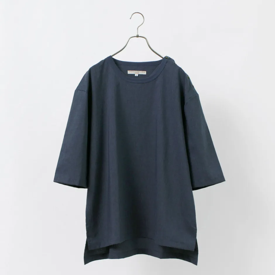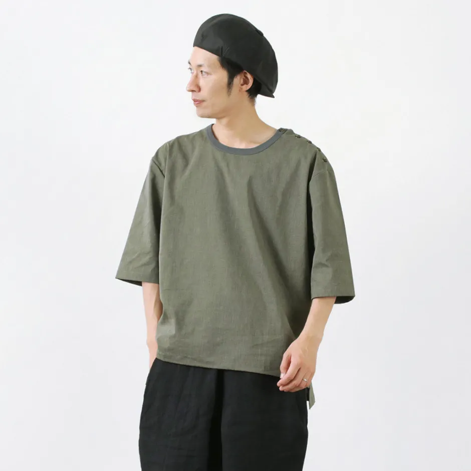 Short-sleeved T-shirt in a hybrid fabric blended with ramie, a type of hemp, and the functional material “COOLMAX yarn”. The buttons on the shoulders are reminiscent of sleeping shirts. A piece with shoulder button accents reminiscent of a sleeping shirt.